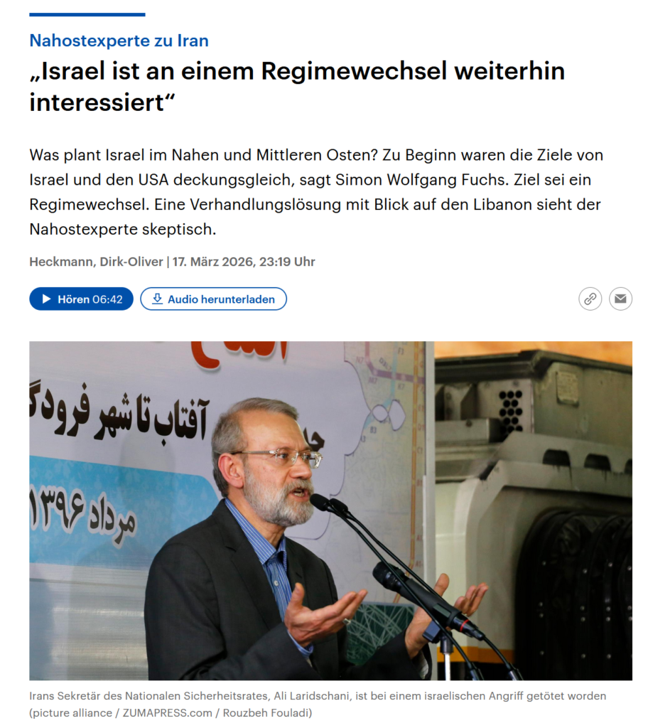 I spoke to Dirk-Oliver Heckmann of German National Public Radio (Deutschlandfunk, “Das war der Tag”) on the day of the killing of Ali Larijani, the head of Iran’s National Security Council, and ramped-up attacks in Lebanon by the Israeli military: